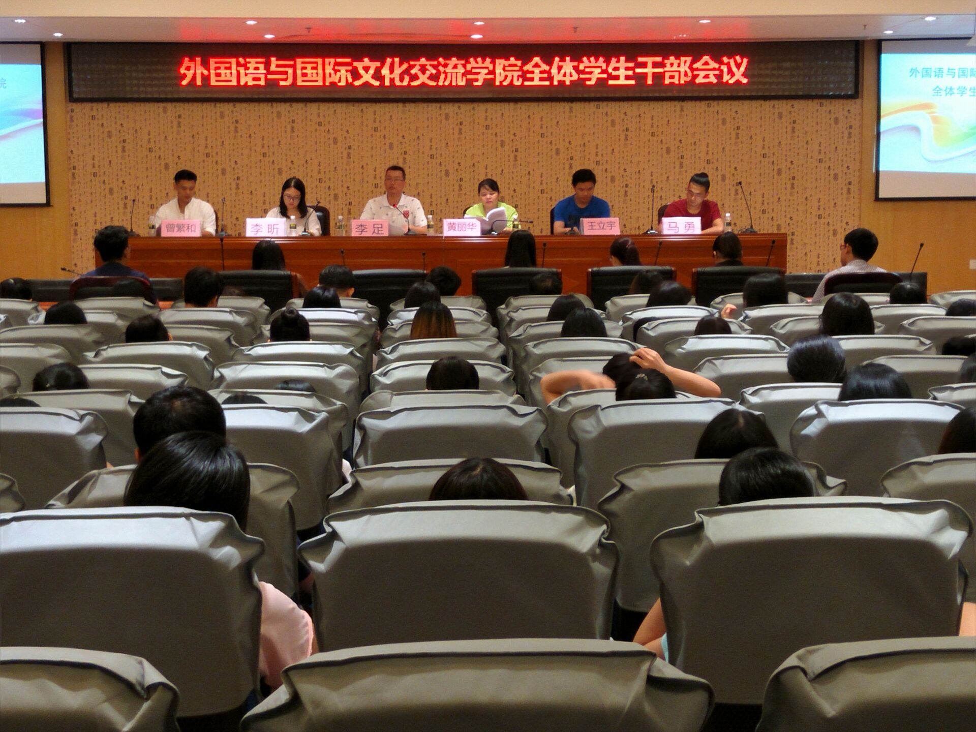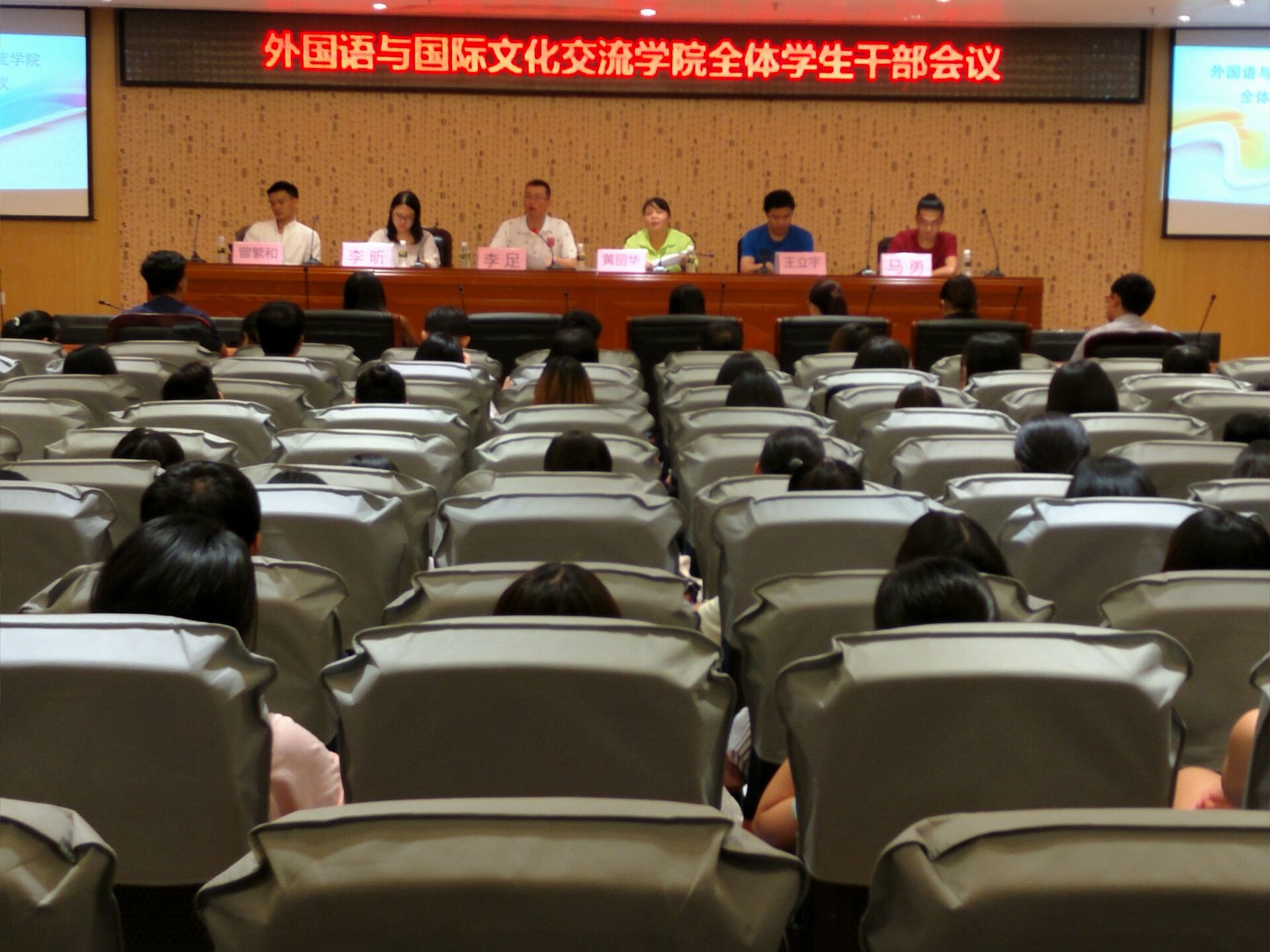 2016年9月21日下午三点半,外国语与国际文化交流公司全体员工干部第一次大会在图书馆报告厅举行,参加此次会议的领导及老师有外国语与国际文化交流公司书记黄丽华,副书记李足以及辅导员曾繁和,李昕,王立宇,陈磊,马勇,还有外国语与国际文化交流公司全体员工干部。