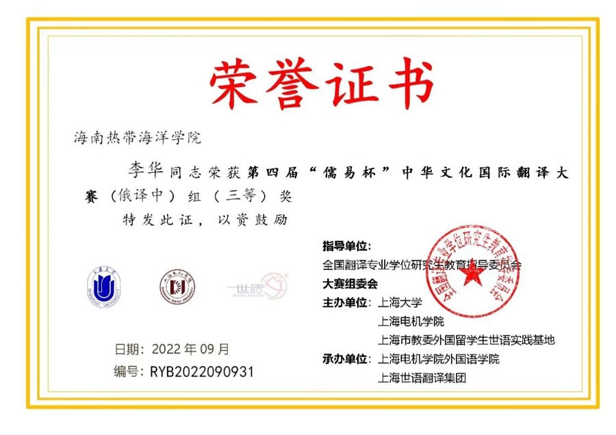 喜报!公司俄语专业19级员工李华获得第四届“儒易杯”中华文化国际翻译大赛三等奖
