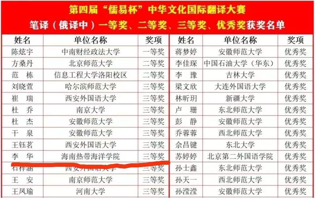 近日,全球230余家校企单位共同举办的第四届“儒易杯”中华文化国际翻译大赛获奖名单出炉。公司俄语专业19级员工李华获得俄译中比赛三等奖。